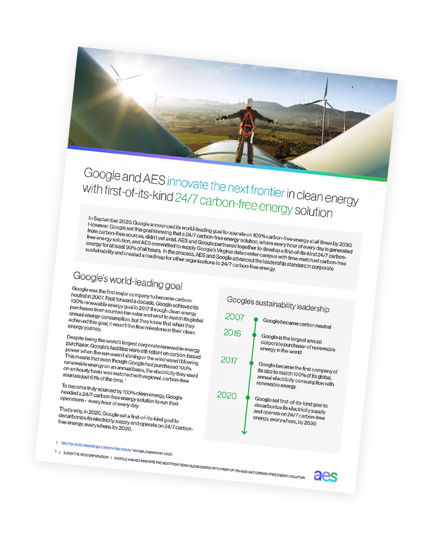 As Google continued to scale, its energy demands grew – and energy management requires time and resources that differ from Google’s core business objectives as a technology innovator. AES worked with Google to further integrate sustainability into its operations and develop a holistic energy management strategy grounded in clean, reliable and cost-effective power. The first in the world of its kind, this clean energy procurement deal between AES and Google is a vital step towards Google’s goal to achieve 24/7 carbon-free energy on an hourly basis by 2030.